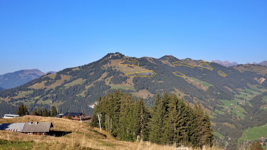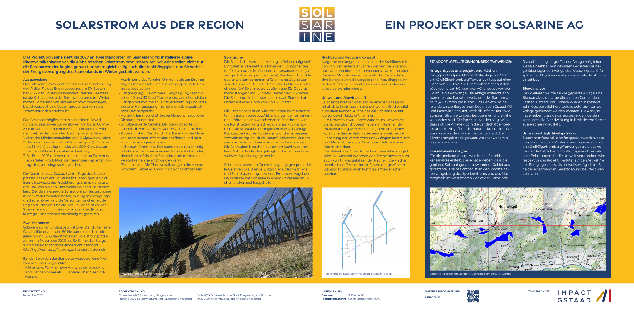 Die geplante alpine Photovoltaikanlage am Standort «Gfell/Eige/Hornberg/Parwenge» liegt auf einer Höhe von 1600 bis 1940 Meter über Meer auf den südexponierten Hängen des Höhenzuges von der Horeflue bis Parwenge. Die Anlage erstreckt sich über mehrere Parzellen, welche in der Summe circa 25,4 Hektaren gross sind. Das Gebiet wird bereits durch die Bergbahnen Destination Gstaad AG und Landwirte genutzt, weshalb Infrastruktur wie Strassen, Stromleitungen, Bergbahnen und Skilifte vorhanden sind. Die Parzellen wurden so gewählt, dass sich die Anlage gut in die Landschaft einbettet und die Eingriffe in die Natur reduziert sind. Die Standorte werden für den landwirtschaftlichen Sömmerungsbetrieb genutzt, welcher weiterhin möglich sein wird.