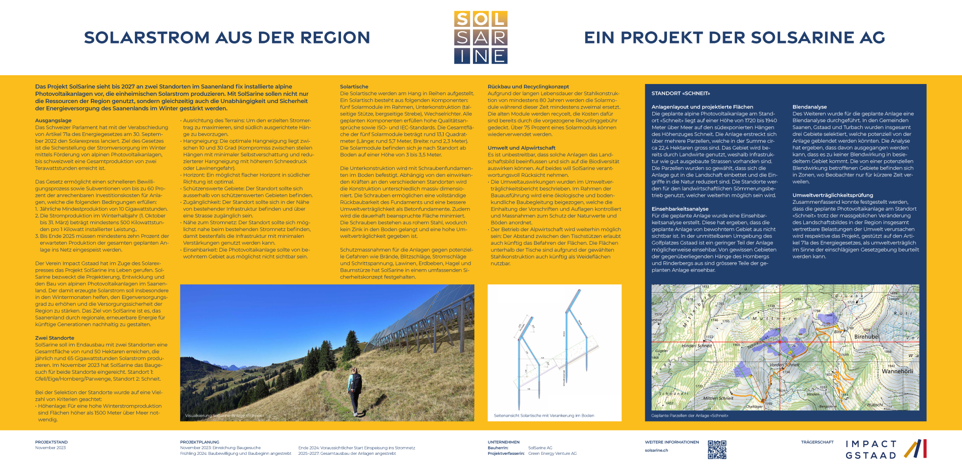 SolSarine soll im Endausbau mit zwei Standorten eine Gesamtfläche von rund 50 Hektaren erreichen, die jährlich rund 65 Gigawattstunden Solarstrom produzieren. Die geplanten SolSarine-Standorte eignen sich besonders gut für die Erstellung von alpinen Photovoltaikanlagen, weil diese alle gut erschlossen sind, bereits eine Infrastruktur vorweisen und eine geringe Einsichtbarkeit haben. Das wirkt sich günstig auf die Gestehungskosten und die Netzanbindung aus. Für eine Bewilligung braucht es die Zustimmung der Standortgemeinden und der Landeigentümer beziehungsweise der Pächter.